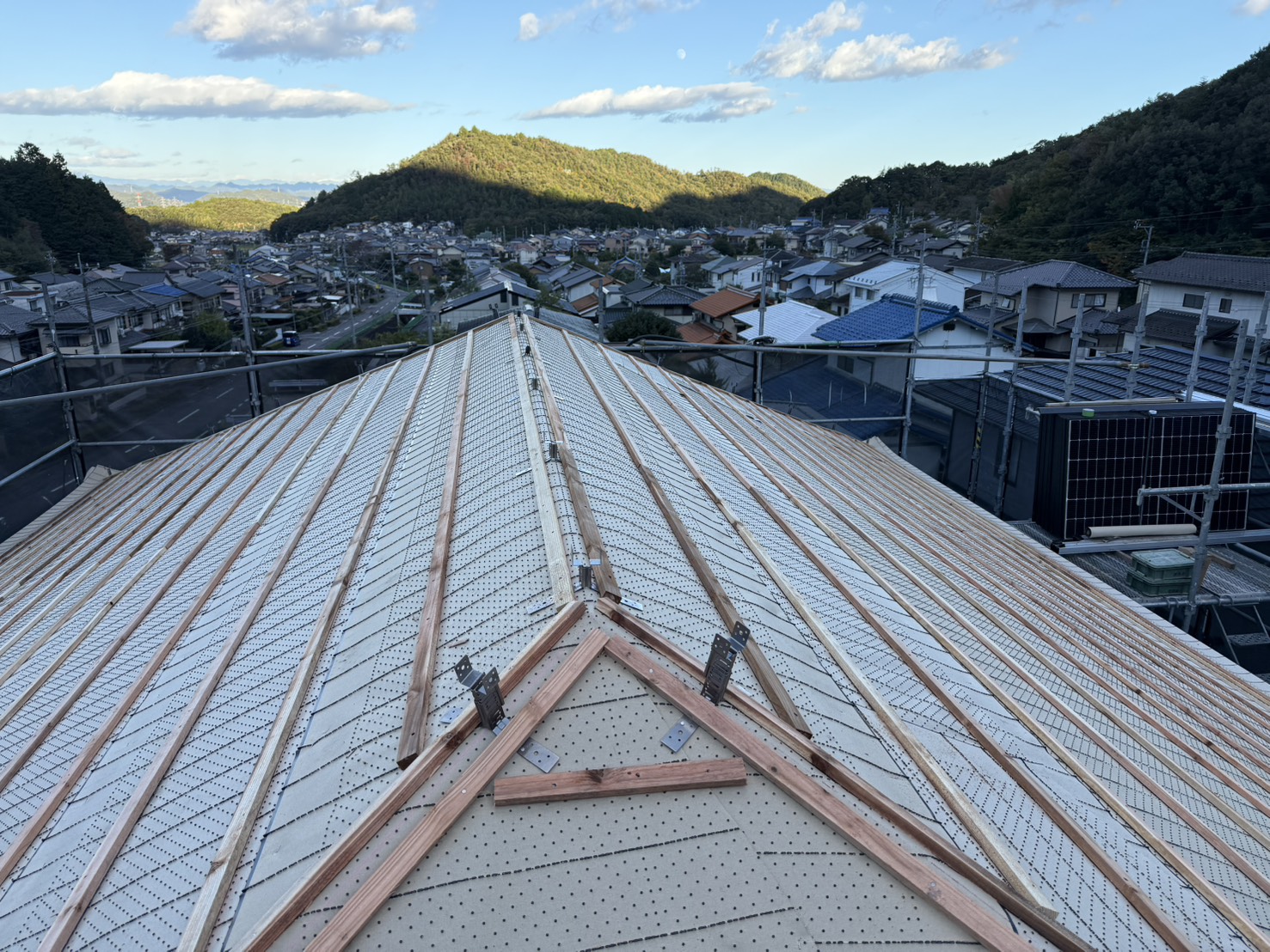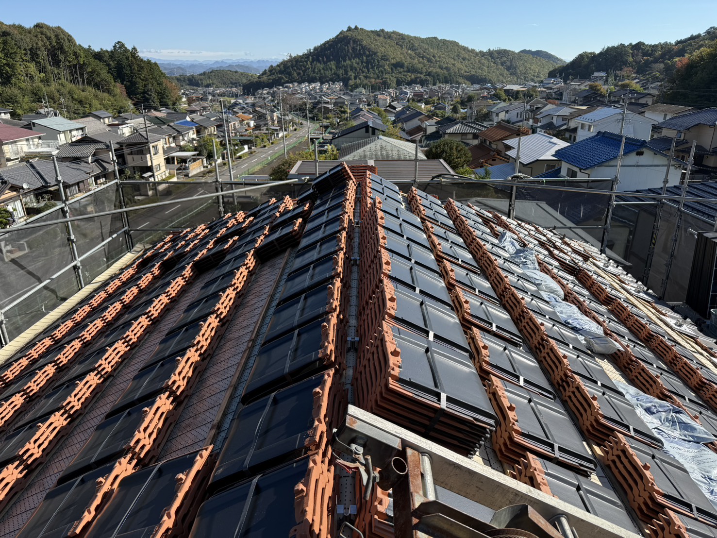 この度は、岐阜市S様邸にて、既存のセメント瓦から高品質な栄四郎瓦UU-44マットブラックへの葺き替え工事を承らせていただきました。太陽光パネルが設置されていたため、一旦パネルを撤去し、新しい下地材支持瓦への交換後にパネルを再設置するという高度な技術が求められる工事でした。