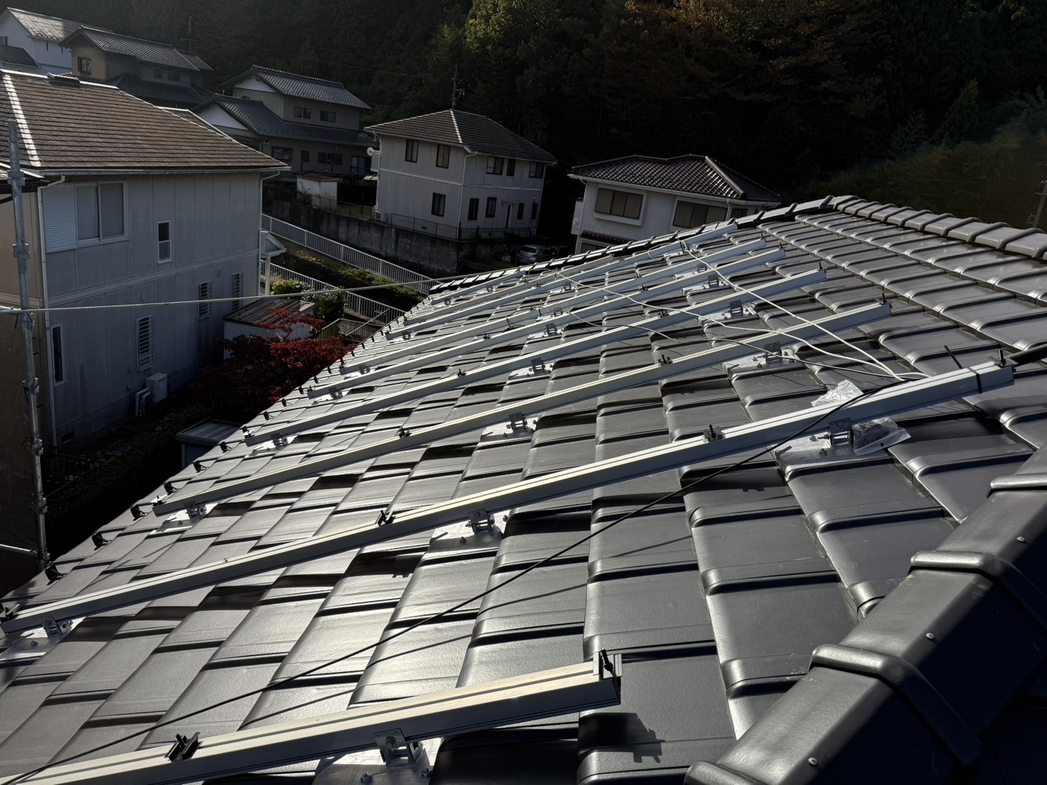 太陽光パネルを安全に支持するため、従来の瓦から専用の下地材支持瓦に交換いたしました。この支持瓦は、パネルの重量を適切に分散し、屋根構造全体の安定性を確保する重要な役割を果たしています。