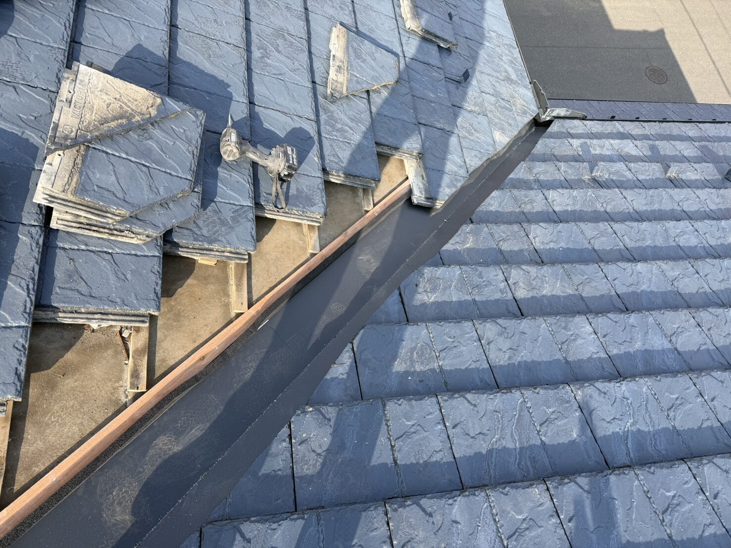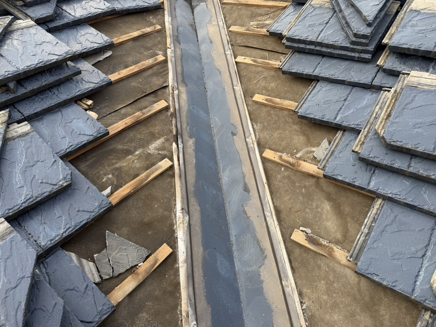 今回の工事は、屋根の谷部分で発生した雨漏りの修理でした。谷とは、屋根の傾斜が交わる凹んだ部分のことで、雨水が集中して流れる箇所です。この谷部分は、大量の雨水が流れるため、経年劣化により穴が開いたり、継ぎ目から雨水が浸入したりすることが多く、定期的なメンテナンスが必要な箇所です。