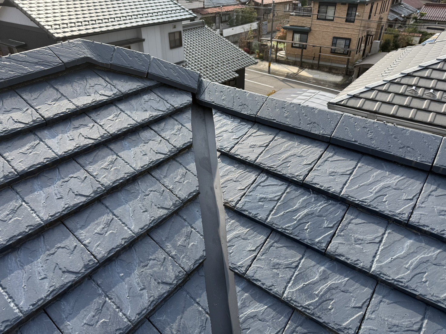 今回の工事では、既存の谷板を撤去し、幅広のカラーステンレス板を使用して施工いたしました。谷板の幅を広くすることで、雨水の流量に十分対応できる排水能力を確保し、オーバーフローのリスクを大幅に軽減いたしました。カラーステンレスは、耐久性と耐食性に優れており、長期間にわたって防水性能を維持できます。また、錆びにくい特性があるため、岐阜県の高温多湿な気候にも適しています。