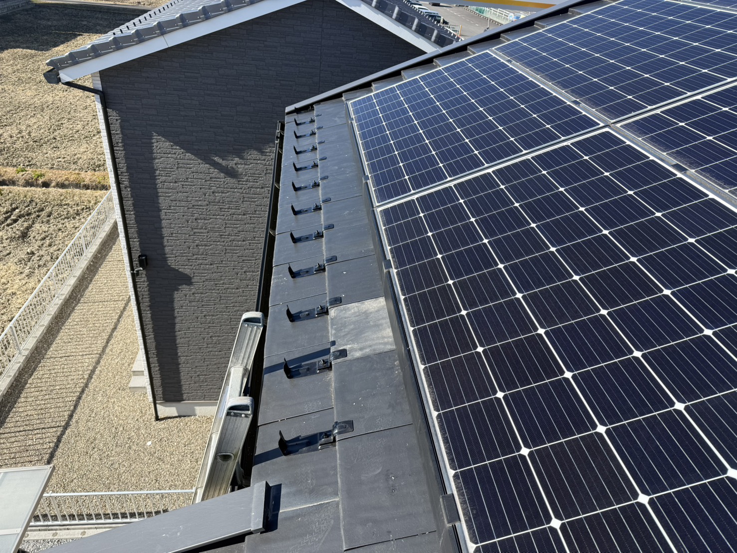 現地調査の結果、ソーラーパネルが設置されている2階屋根部分に、雪止め金具を設置することをご提案いたしました。K様邸では、既存の瓦を捲らずに施工できる後付け雪止め金具を使用し、瓦の間に金具を差し込んで固定する工法を採用いたしました。ソーラーパネルの配置に合わせて、最適な位置に雪止め金具を配置し、落雪を効果的に防止できる構造といたしました。施工は1日間で完了し、お子様の安全を確保できる環境が整いました。